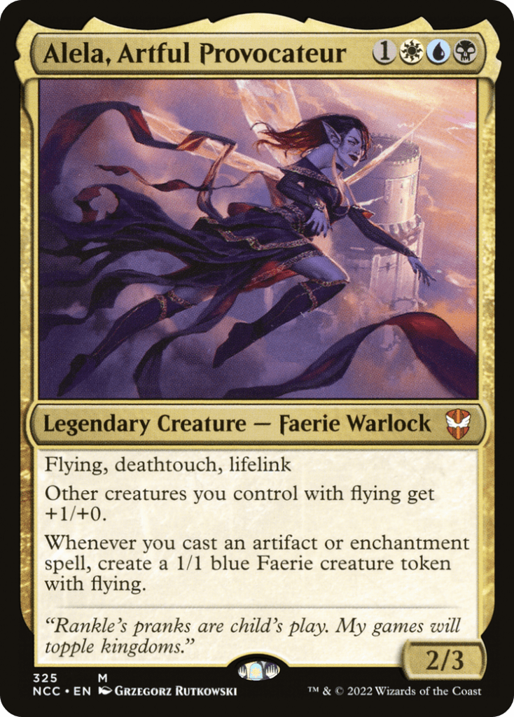 A four mana 2/3 that has flying, deathtouch, and lifelink, give other fliers you control +1/+0 AND whenever you cast an artifact or enchantment spell, you make a blue 1/1 Faerie token with flying.