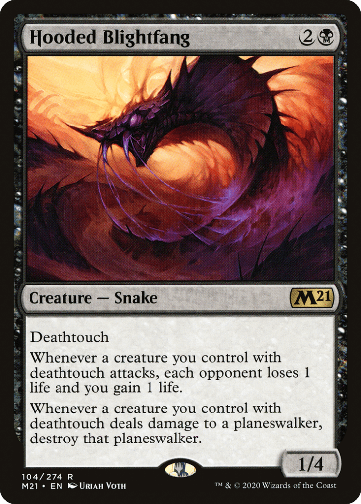Hooded Blightfang is excellent in this case because it gives all of our creatures the ability to drain all of our opponents, which if we have a full party of at least four creatures then we can drain for 4 life when we get Zagras out, who also has deathtouch.