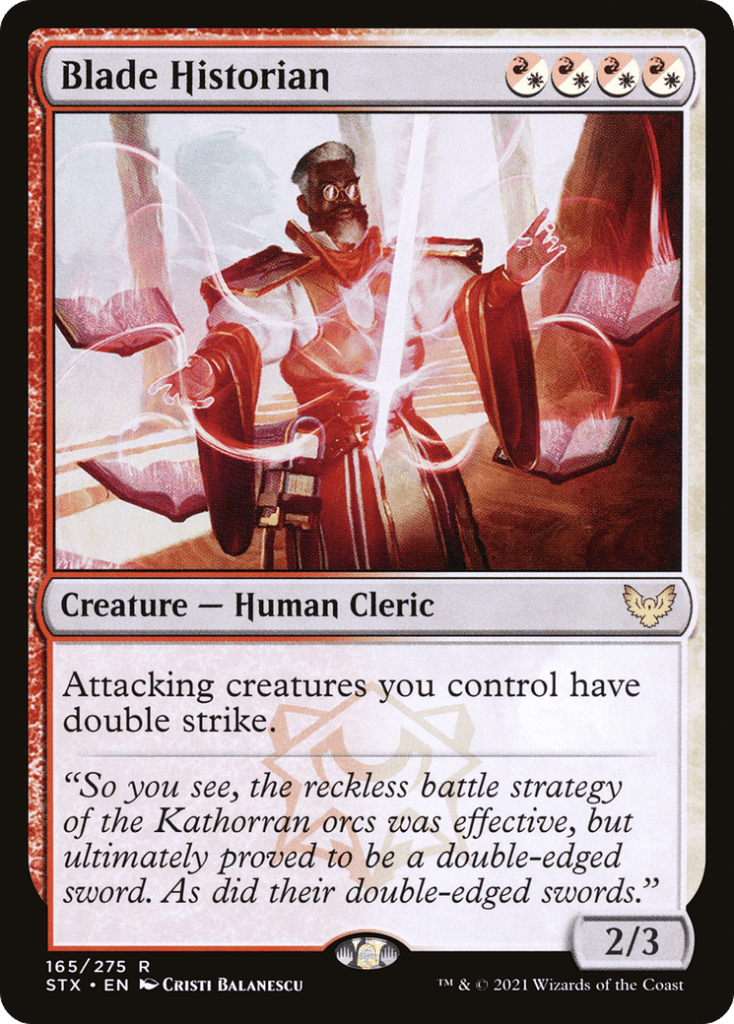 Blade Historian is going to be the upper end of our mana curve, and it is going to help us close out games because they give double strike to attacking creatures.