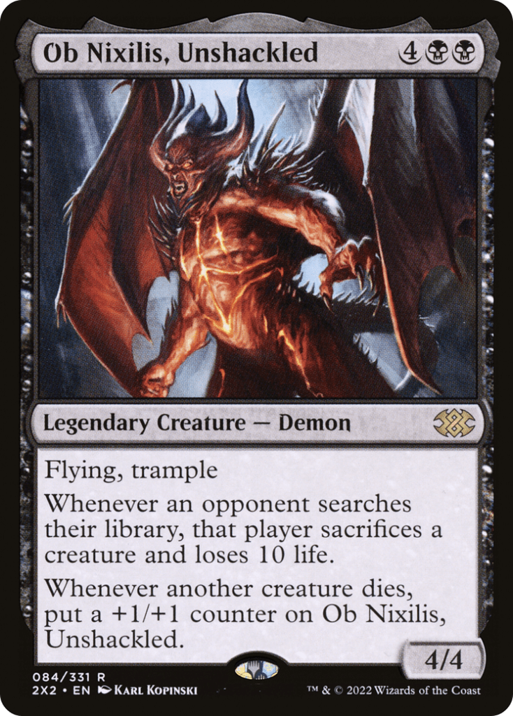Ob Nixilis, Unshackled forces our opponent to sacrifice a creature and lose 10 life when they search their library, which can quickly become a problem if they already used their removal on Maralen.