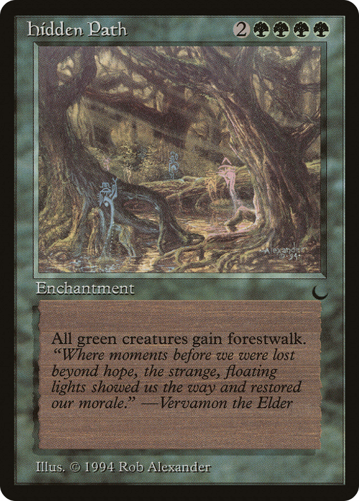 Hidden Path has four green pips and it gives all green creatures forestwalk, which is a risky play, but that means we can expand our card pool to include other creatures that don’t have forestwalk.