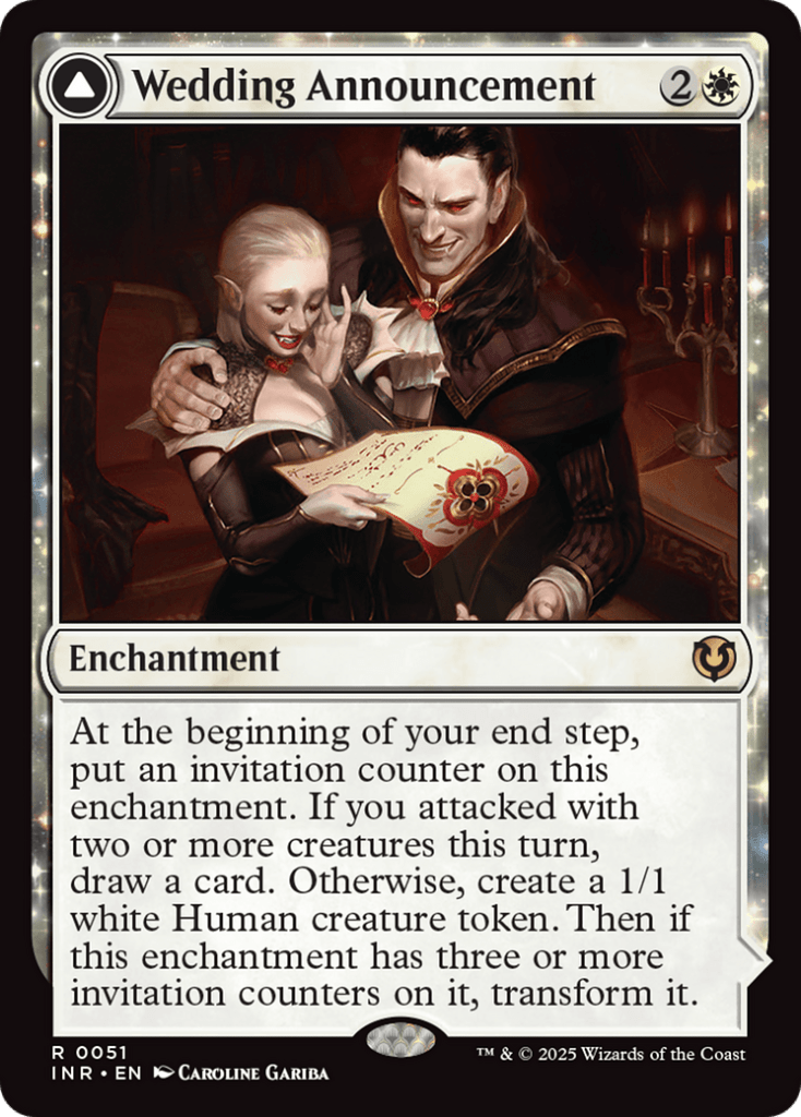 Wedding Announcement is a solid way to get some bodies onto the battlefield relatively cheaply, offers card advantage, and when it flips it becomes an anthem to make our attacks better.