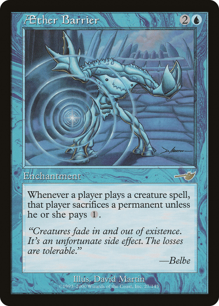 Aether Barrier is a way to limit the number of creature spells our opponents can cast each turn, forcing them to either pay more mana or sacrifice a permanent.
