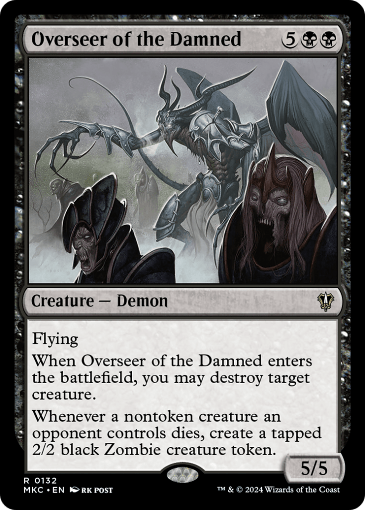 Overseer of the Damned is an option because not only is it a Demon, but it destroys something when it enters and a whenever a nontoken creature an opponent controls dies, we create a tapped Zombie token, which we can sacrifice if we need to.