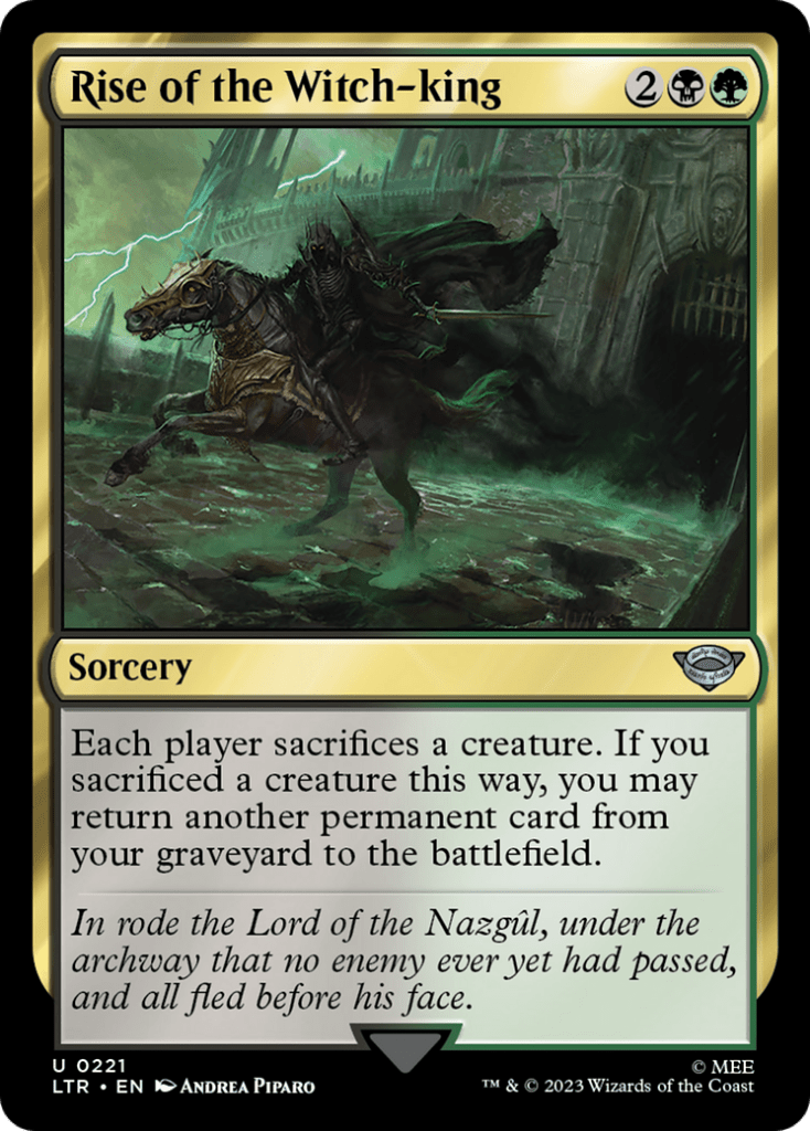 Rise of the Witch-King is a solid enough removal spell that can allow us to bring a creature back while also getting rid of a bunch of our opponents creatures. To help us get into that position we can use Grisly Salvage to get a creature or land to put into our hand and put the rest into the graveyard.