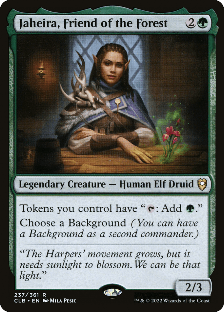 Jaheira, Friend of the Forest is perfect in this instance for the simple fact that she turns our Clue tokens into mana rocks that we can use to cast some of our bigger spells.