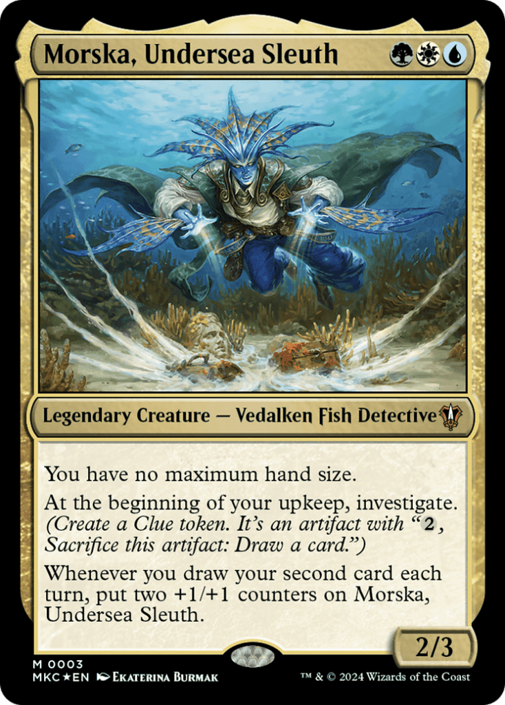 Morska is a three mana 2/3 that gives you no maximum hand size, investigates at the beginning of your upkeep and whenever you draw your second card each turn then you put two +1/+1 counters on Morska.
