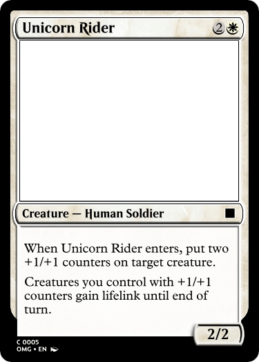 Unicorn Rider seems fairly balanced to me, though the number of counters it gives out and the ability to give you creatures you control with +1/+1 counters can change if necessary.