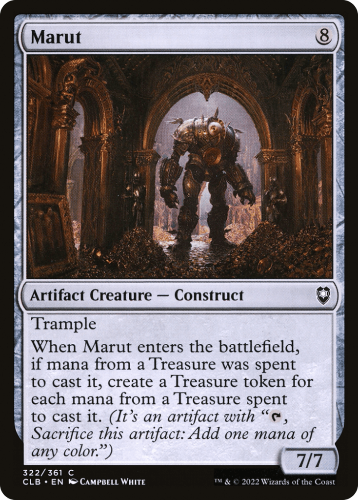 Marut is an interesting creature in that if mana from a Treasure was spent to cast it, we create a Treasure token for each mana from a Treasure spent to cast it. If we happen to have a Goldspan Dragon out then we can spend four Treasure to get eight Treasures back, while also giving the Marut eight +1/+1 counters.