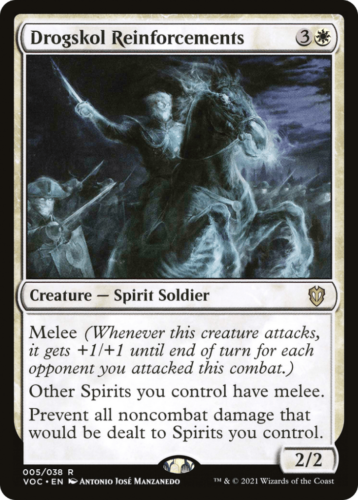 Drogskol Reinforcements is creature that can give other Spirits we control Melee, which means our Spirits get bigger the more opponents we attack and they also happen to get protection from any noncombat damage. This means that we can play damage based board wipes like Blasphemous Act while still having our Spirits in play.