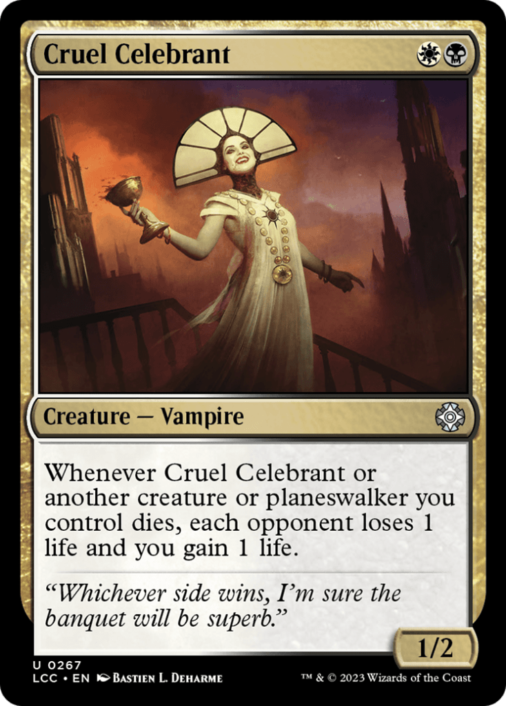 Cruel Celebrant is great in this regard because whenever a creature or Planeswalker we control dies each opponent loses 1 life and we gain 1 life. In a similar vein, Elas il-Kor, Sadistic Pilgrim gains us 1 life whenever a creature we control enters and each opponent lose 1 life whenever a creature we control dies.