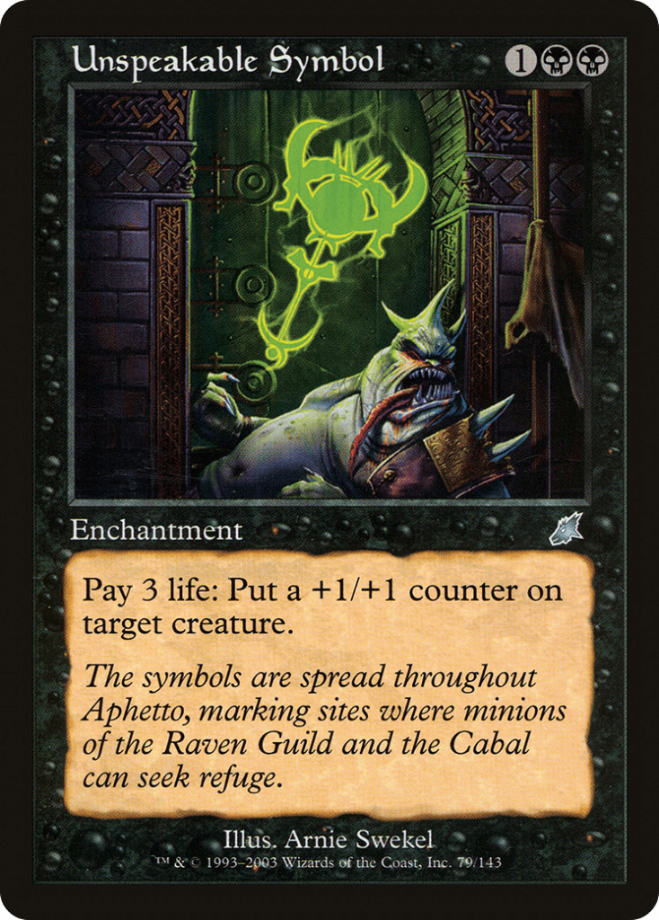 Fortunately Unspeakable Symbol is card that can not only get us to a lower life total than our opponents, but can also at instant speed put a +1/+1 counter on a creature that we control, all for the low low price of 3 life.