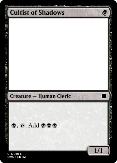 Cultist of Shadows is a Dark Ritual reference that I think I will probably change in the future. I made a cycle of Boon Charms and I feel like that this card is encroaching in that space, so I wouldn’t be surprised if it gets a complete overhaul in the future.