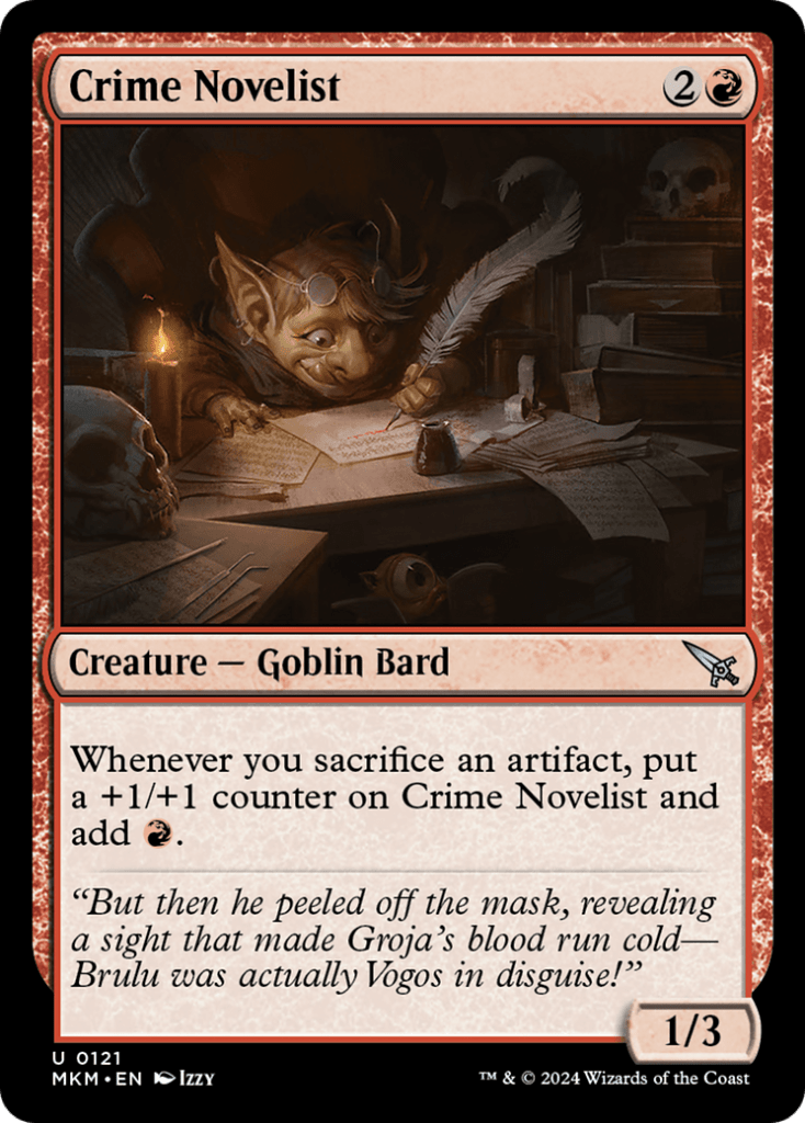 Crime Novelist is a way we can make use of them as artifacts since whenever we sacrifice an artifact we put a +1/+1 counter on it and make an additional red mana, meaning we get two mana for one Treasure. Though we could also play Goldspan Dragon in that case to get three mana for one Treasure.