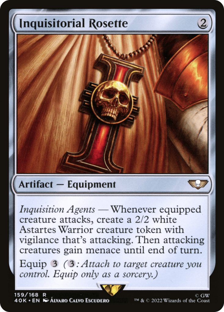 Inquisitorial Rosette is a way for us to get an attacking Astartes Warrior with vigilance and give other attacking creatures we control menace, which if we played correctly should be decent sized Warriors going on the attack.