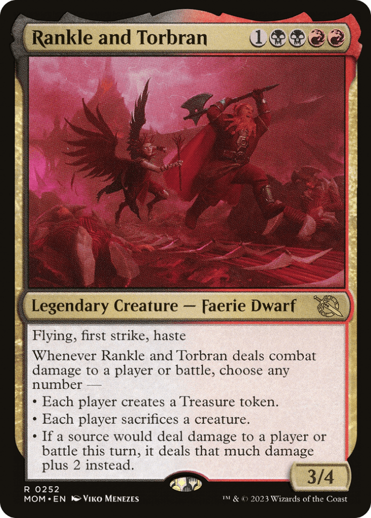 Rankle and Torbran are excellent examples of us getting potentially a lot of damage through because when we deal combat damage to a player or battle then we can choose any number of either giving everyone a Treasure token, each player sacrificing a creature, and most importantly if a source we control would deal damage to a player or battle, it deals that much plus 2 instead.