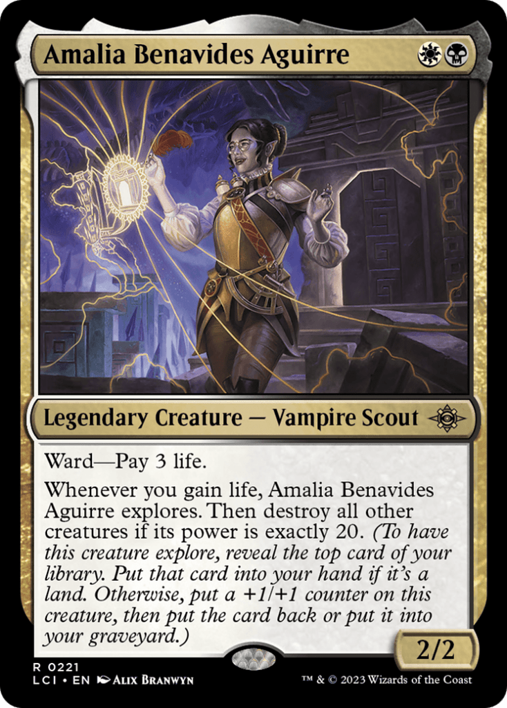 Amalia is a two mana 2/2 with a ward of pay 3 life and whenever you gain life, Amalia explores then if her power is exactly 20, destroy all other creatures.