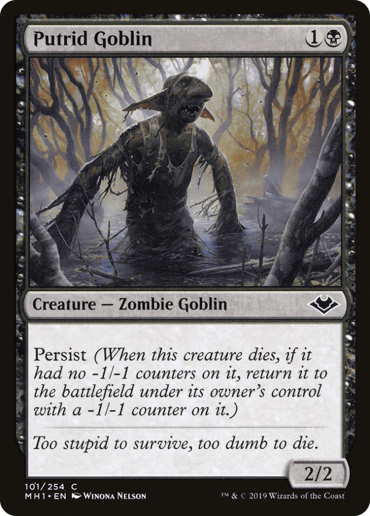As far as creatures we want to sacrifice, Putrid Goblin is such an excellent example because it can come back with Persist, which means it comes back into play with a -1/-1 counter, which means if we put a +1/+1 counter on it then it cancels out and it can be sacrificed over and over again.