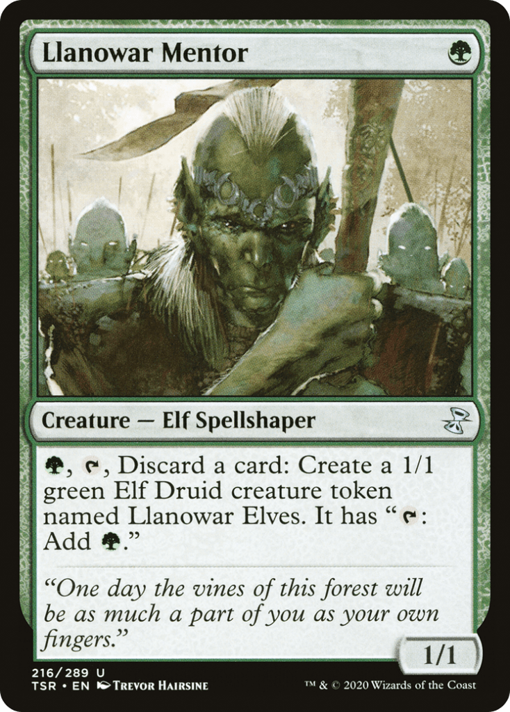 Llanowar Mentor is a cheap creature that we pay one mana and discard a card in order to create a Llanowar Elves token, which is exactly like a Llanowar Elves in that it can tap to make a green mana.
