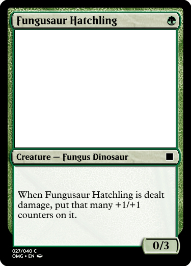 Fungusaur Hatchling was probably the card I am most proud of because the original Fungusaur had an ability to get a +1/+1 counter on it when it took damage. I decided to make that ability a bit stronger in that if the Hatchling were to survive the combat it would get stronger, which is in line with the flavor text of Fungusaur.