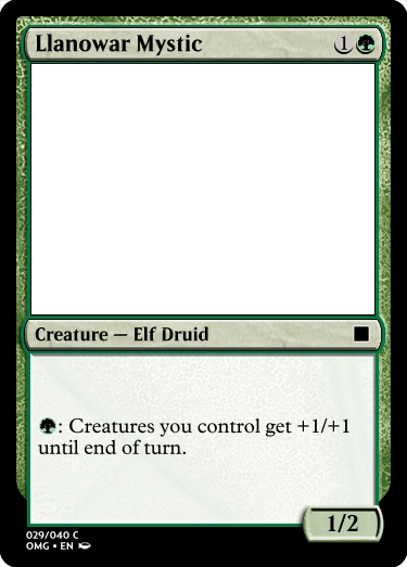 Llanowar Mystic (surprisingly a name not taken) was something that I think could help buff your creatures for an aggressive strategy. I originally had it be a tap ability, but decided to make it a mana sink ability as a way to help be an offensive tool, while also having some defensive utility.