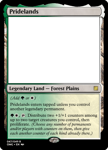 Vast Highlands being an Overrun effect is pretty strong, and while I think it is fine as it is, I may change it to a set number if I feel that it needs to be toned down. Pridelands being able to give two of your creatures +1/+1 counters and then proliferating is pretty nice and plays well with the +1/+1 Counters archetype in white and green.