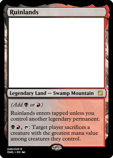Ruinlands originally had a worse version of the effect where I had the player sacrifice a card and if it was power 4 or greater draw a card, but I think that having an Edict effect that gets rid of the highest mana value creature an opponent controls is stronger overall.