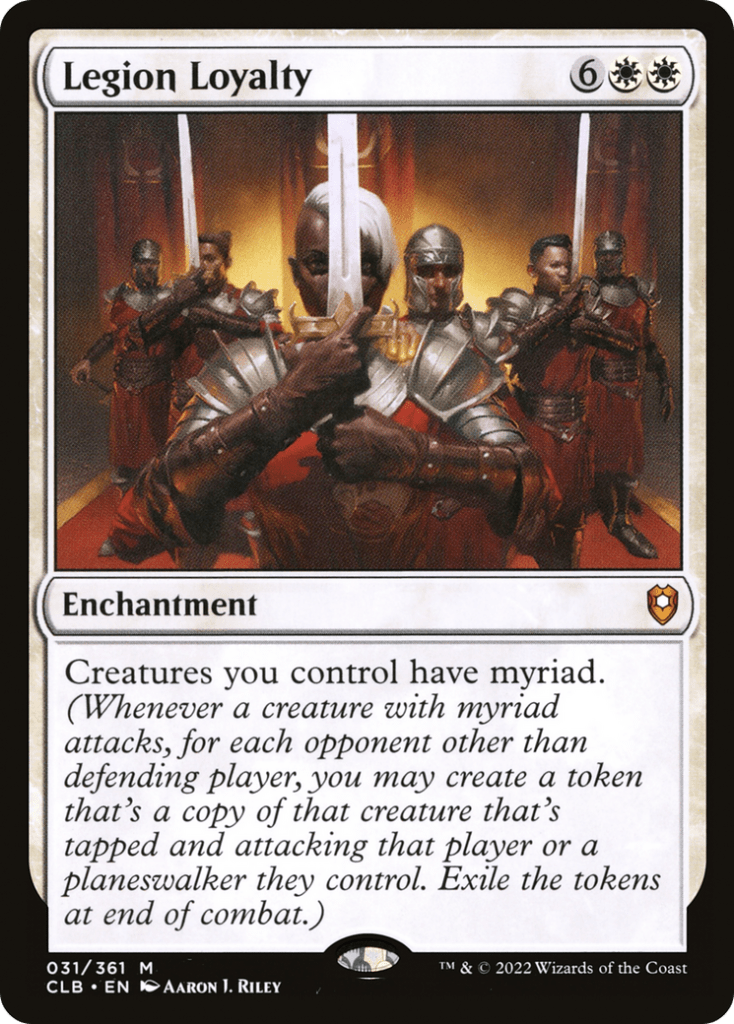 Legion Loyalty is a great and simple way to get value from giving creatures we control myriad, and by making a ton of creatures from all the creatures that we have that are attacking everyone can definitely make things more difficult for all of our opponents to deal with. While Dion and Bahamut don’t get much benefit from having myriad because of the legend rule, the token copies do get their enters effects which can make either more Knight tokens or buff creature we control even more.