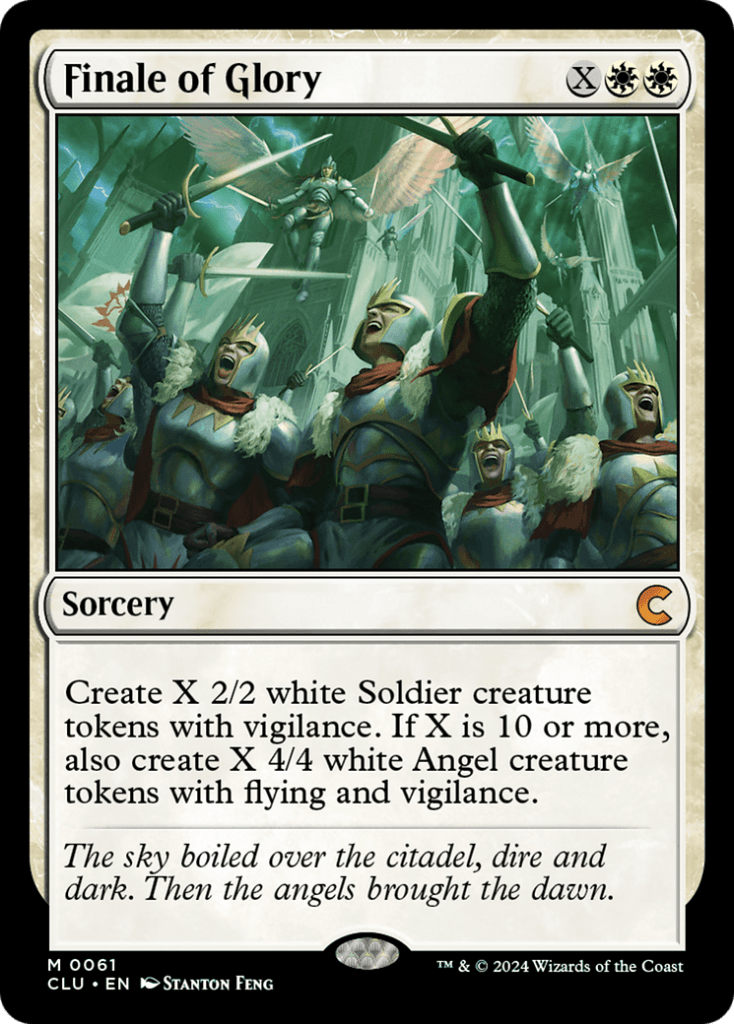 Finale of Glory is appropriately named because with Baylen we can use some of our incidental tokens to help make mana to get this to get X to be 10 or more in order to get a huge suite of Soldier tokens and Angel tokens, of which we can use to get Baylen even bigger.
