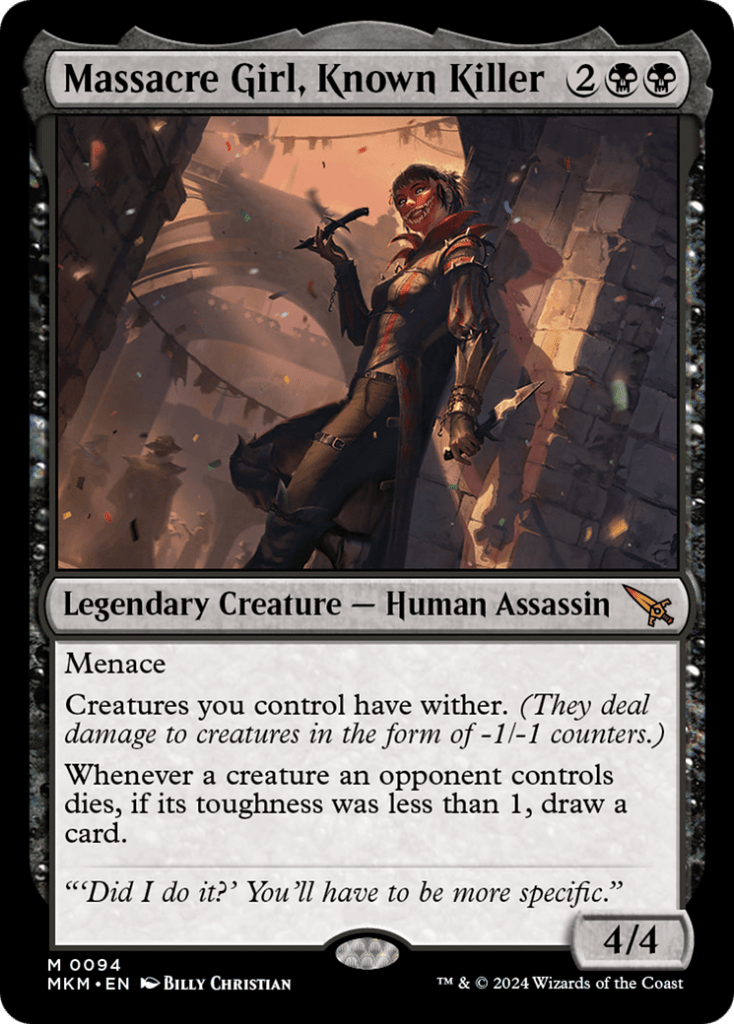Massacre Girl, Known Killer is pretty solid here in that not only does she give creatures we control wither, which has our creatures deal -1/-1 counters instead of damage, but she also lets us draw a card if a creature our opponent controls dies when it’s toughness was less than 1.