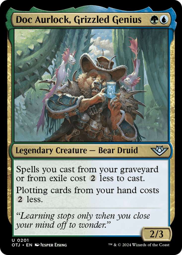Speaking of, we also need ways to discount the spells that we are going to be casting from our opponents. This is where something like Doc Aurlock, Grizzled Genius comes into play, because these cards are exiled we get a two mana reduction to cast them, as well as discounting casting spells from our graveyard.