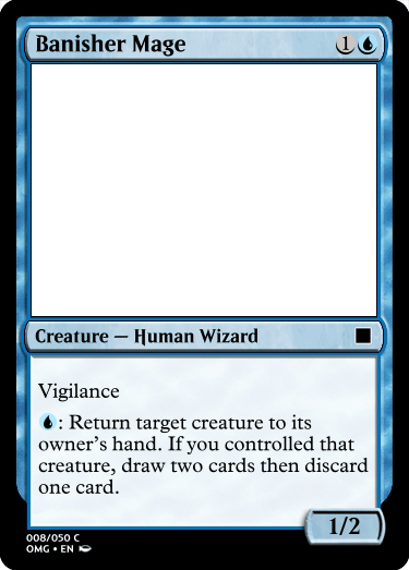 This went through a bit more of a change. Instead of having to tap and pay mana to bounce a creature, I changed it to just be a bounce for one mana and instead of drawing one card if you controlled the creature, you instead draw two cards then discard one.