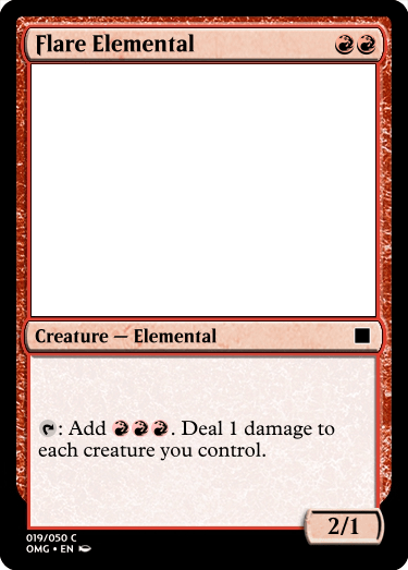 Next up we have Flare Elemental, in which instead of adding two mana and dealing 1 damage to one creature, instead we add three mana and deal 1 damage to each creature we control.