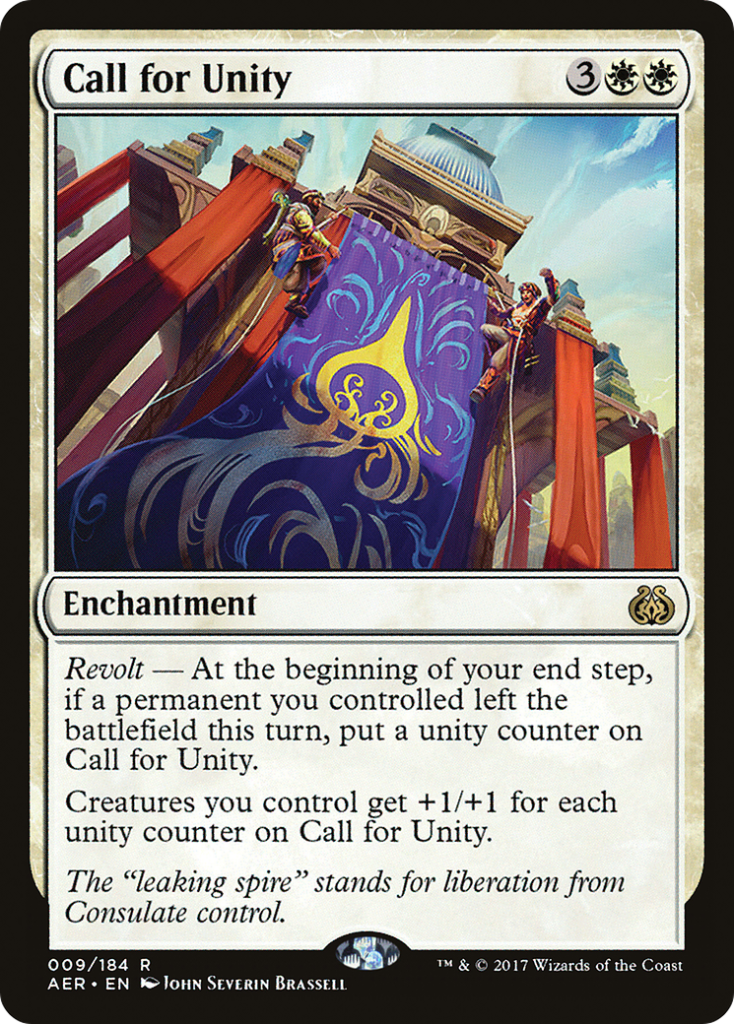 Call for Unity is great because it has Revolt, which at the beginning of our end step if a permanent we controlled left the battlefield this turn then we put a unity counter on it, and creatures we control get +1/+1 for each unity counter on it. If we get at least one thing off our battlefield each turn then we can make the normally small tokens Genku makes into powerhouses.