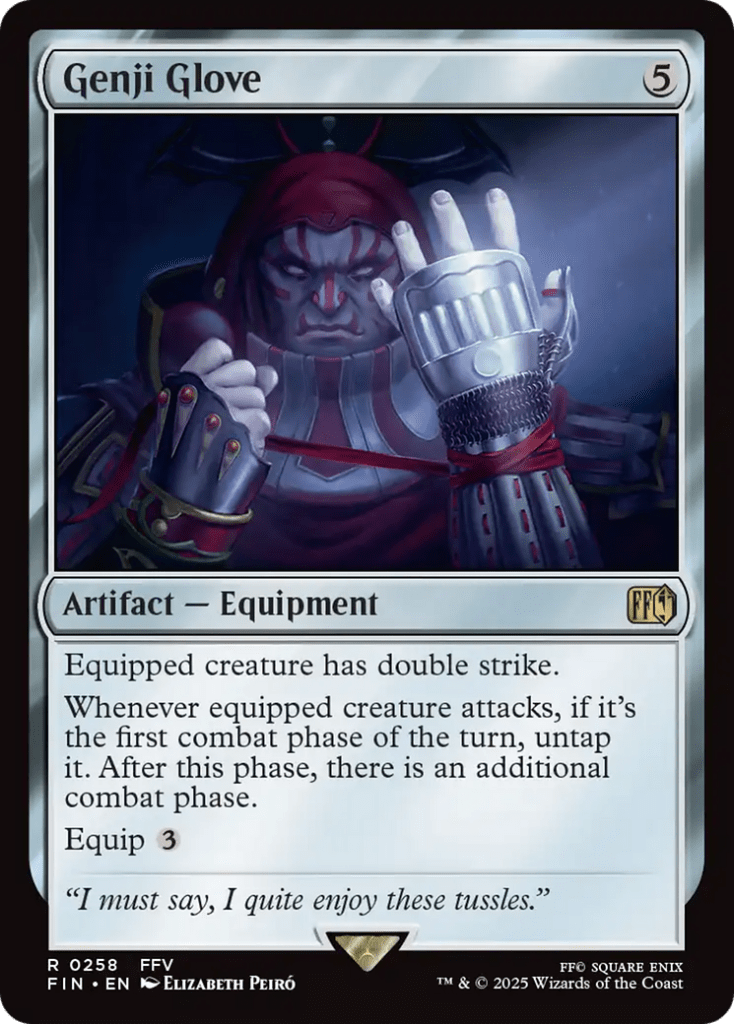 Genji Glove is great because we can attach it to Korvold in order to give him double strike, which is incredibly effective since he also has trample, and whenever he attacks during the first combat phase of our turn then we untap him in order to gain an additional combat phase, which takes advantage of Korvold getting better after dealing combat damage to a player while also drawing us a ton of cards.