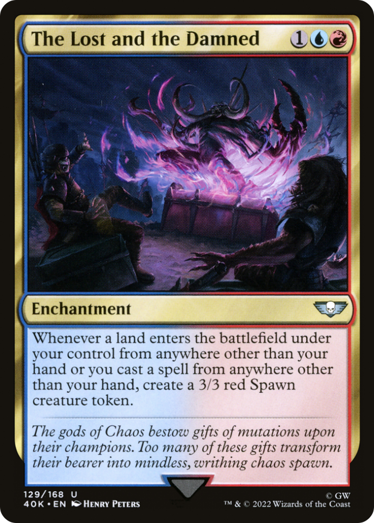 The Lost and the Damned is perfect for this since it triggers whenever we get a land onto the battlefield from anywhere other than our hand or we cast a spell from anywhere other than our hand then we get to make a 3/3 red Spawn creature token, which if we get early enough can mean a lot of additional bodies.