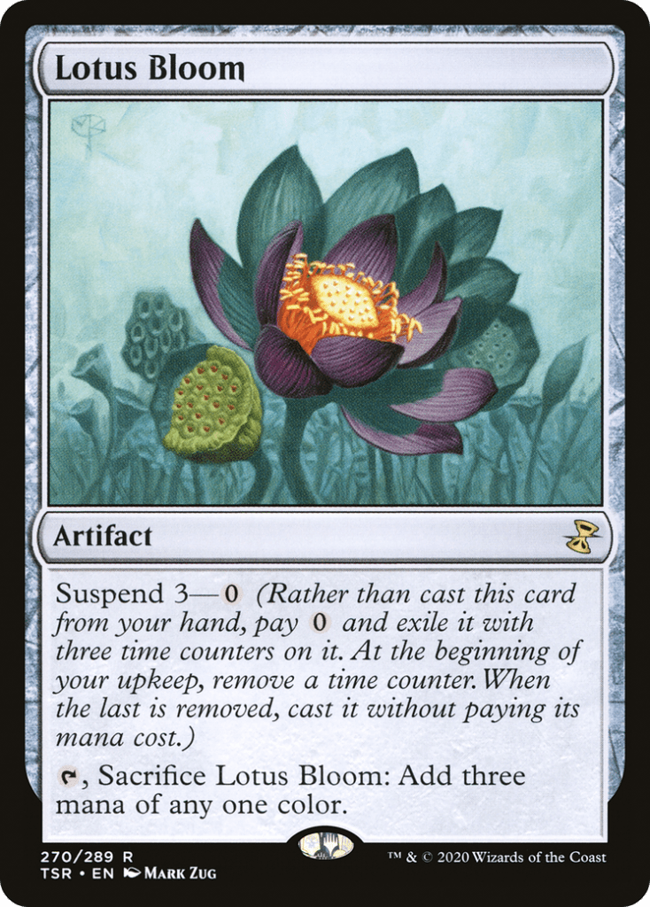 Lotus Bloom is an example of a great way to get a good chunk of mana because it has a Suspend cost of 0 for three turns and once we have Mizzix out we can copy the Lotus Bloom in order to get six mana pretty much instantly. In a similar vein we can also use something like Sol Talisman and Mox Tantalite to get two Sol Rings and two Moxes for a turn.