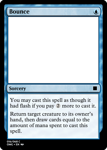 Bounce was a fun card for me to make because one, there hasn’t been a card named Bounce and I wanted to have one named that, and two it was a take on Unsummon that could be used in the early game to bounce a creature at sorcery speed and draw a card, or in the mid to late game as a way to bounce a creature at instant speed and then draw three cards. A bit pushed potentially, but one that I think can serve well at Common.