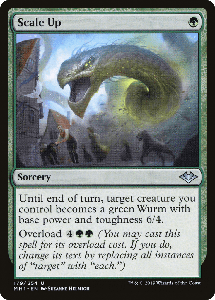 Since a lot of our strategies are creature based, have ways of making our creatures stronger is a solid start. Scale Up normally can make one creature we control a Wurm with power and toughness 6/4, but with Overload we can make all of our creatures 6/4 creatures, since Gaddock only cares about base mana value, additional costs and reductions are not factored in.