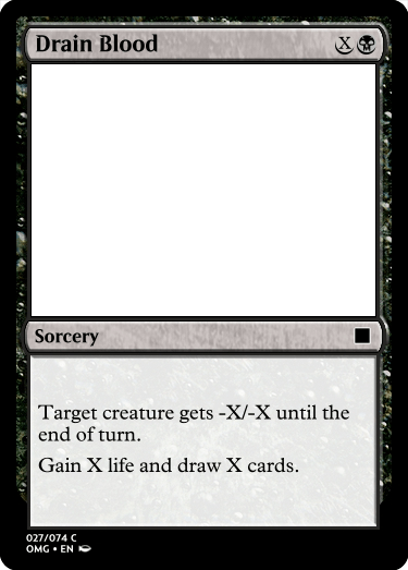 Moving onto the sorceries, Drain Blood came about as an homage to Drain Life rather than a direct reference because Drain Life is a bit complicated. Instead I opted for a card that reduce power and toughness while also gaining you life and drawing cards, though at Common I may end up changing it to losing life if I feel its necessary to balance it.