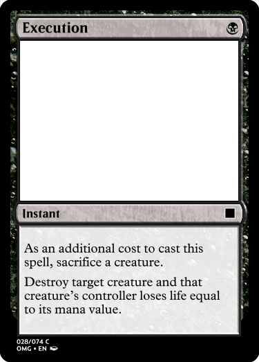 Starting off with Execution, I wanted a destroy creature spell along with adding a Bone Shards type of cost in order to have a solid removal piece at Common at a cost. The life loss was added more so to help keep the game moving, because there are times when a game needs to go and while a kill spell can help, a bit of life loss is not a bad thing.