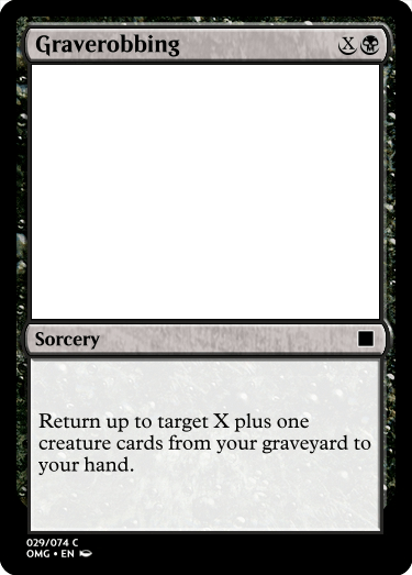 Graverobbing is another direct reference, this time to Raise Dead, but I wanted to push how many creature cards you could bring back. I originally had it as X creature cards, but then decided that since Raise Dead already gave you one creature at one mana that this card also get you a creature card plus however much mana you put into it as a bonus.