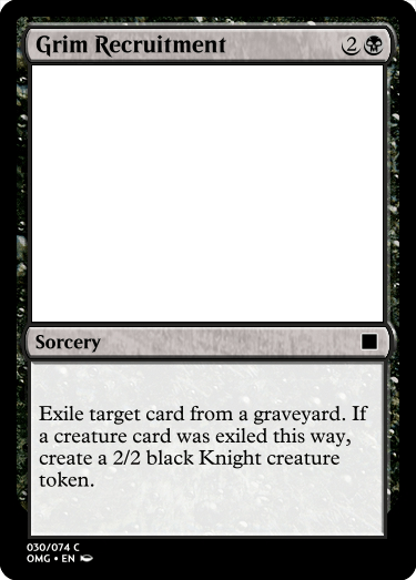 Lastly was Grim Recruitment, which serves more of a functional reason to have been made because having a bit of graveyard removal is necessary for a set to have made available, and to add a bit of synergy with the white and black archetype of Knights in making a Knight token if a creature was exiled.