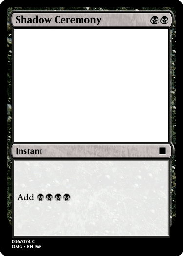 Next came Shadow Ceremony, which is a two mana ritual card that gives you four mana, very much being a direct reference to Dark Ritual. I thought that having this at Common would be fine, and while one of the Boon Charms I made also adds mana, I think that one additional source won’t be too bad. I could end up making it a sorcery in the future to balance things out and switch one of the sorceries here to be an instant instead.