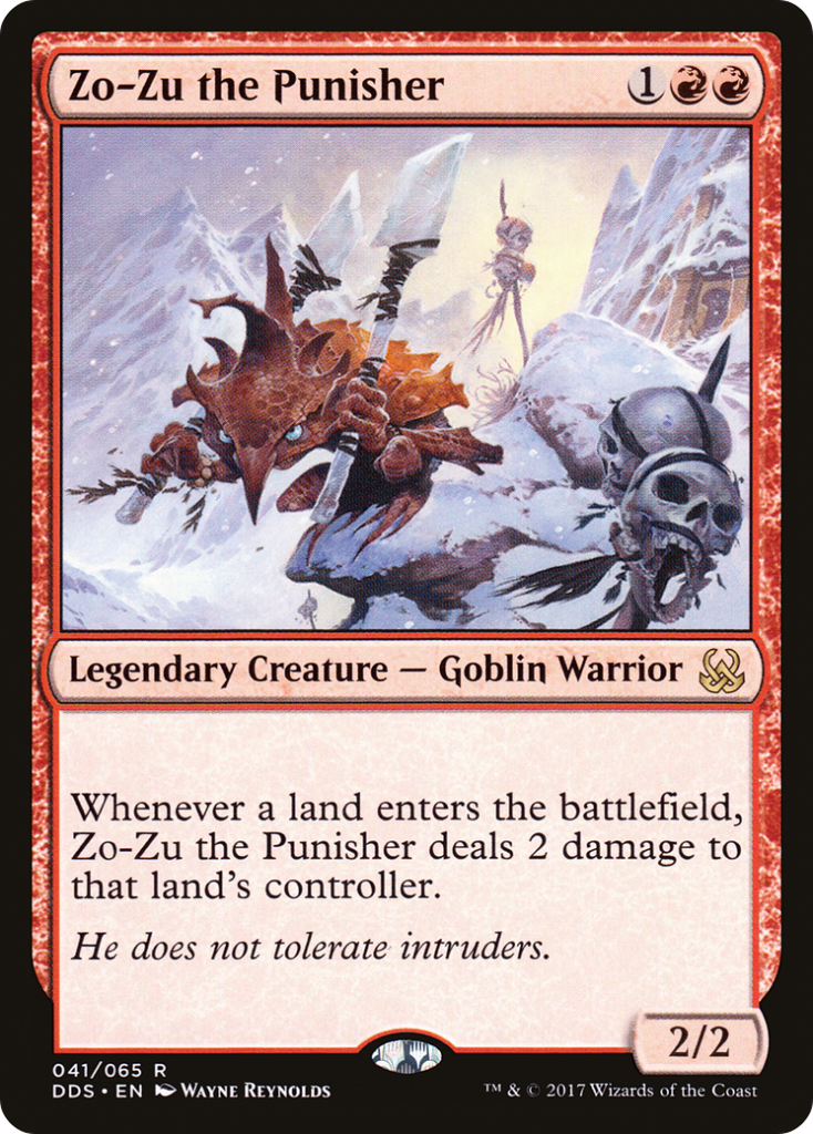 Zo-Zu is a three mana 2/2 that whenever a land enters the battlefield, he deals 2 damage to that land’s controller.