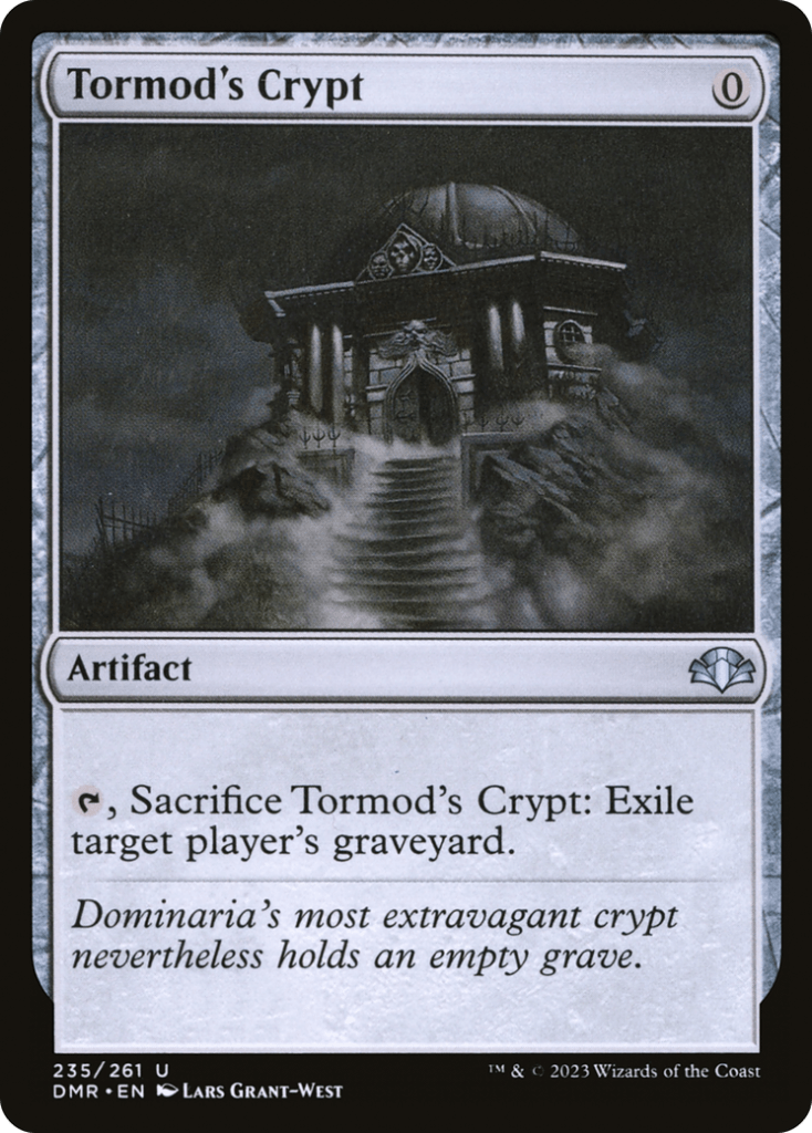 Tormod’s Crypt is an excellent utility artifact that we can play for zero mana and tap it and sacrifice it to exile a player’s graveyard, which is most effective as more of a deterrent than anything because if we have it in play then the graveyard players either work to remove the Tormod’s Crypt or convince us not to target them.