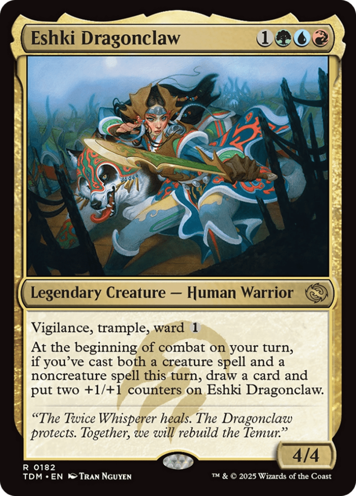 Eshki is a four mana 4/4 with vigilance, trample, ward 1, and at the beginning of combat on your turn if you’ve cast both a creature spell and a noncreature spell this turn, draw a card and put two +1/+1 counters on Eshki.