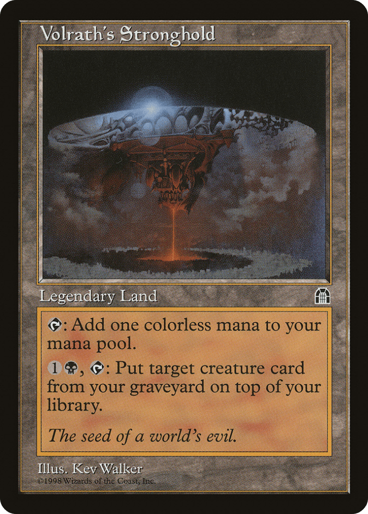 My land pick is Volrath’s Stronghold and my artifact picks are Bullwhip, Ensnaring Bridge, Heartstone, Hornet Cannon, Horn of Greed, Jinxed Ring, Mox Diamond, and Volrath’s Laboratory.
