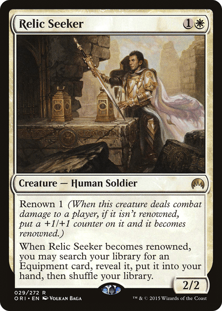 While the obvious answer would be to use tutors, since this deck leans on a gimmick strategy, I think slower tutors would be more interesting to play with. Relic Seeker is a way for us to tutor for an Equipment into our hand once it becomes renowned, which means all we need to do is have it deal combat damage to a player.