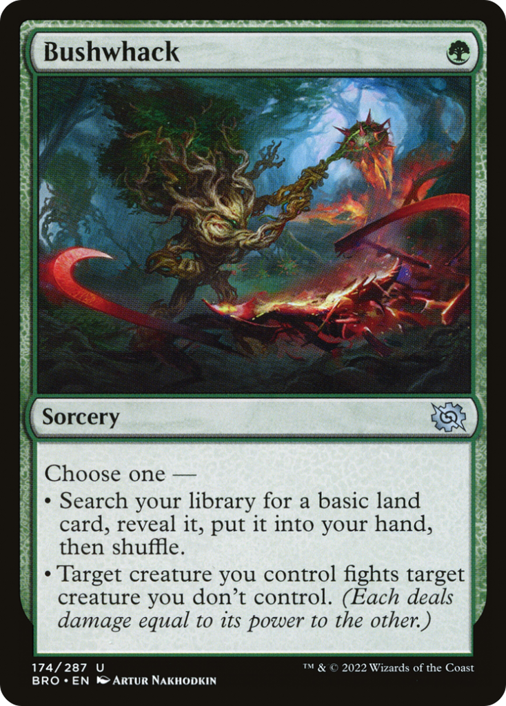 Bushwhack is an excellent utility card in this aspect because in the early game it can be used to get a basic land into our hand to fix our mana, but in the late game can be used to have our creatures fight a cheap creature token so that we can get a Dragon on our end step.